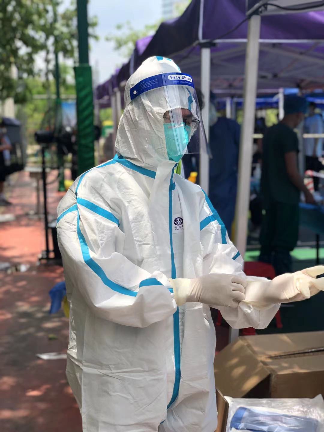 来自肇庆四会人民医院的陈医生告诉记者,今早6点他们从医院出发,赶来支援东莞核酸采样。只吃了早餐、又不敢喝太多水,忙到中午12点多,陈医生脱下防护服后,里面的衣服被汗水泡透了。匆匆扒了几口饭,他再度穿好防护服上阵,将同事替换下来吃饭。