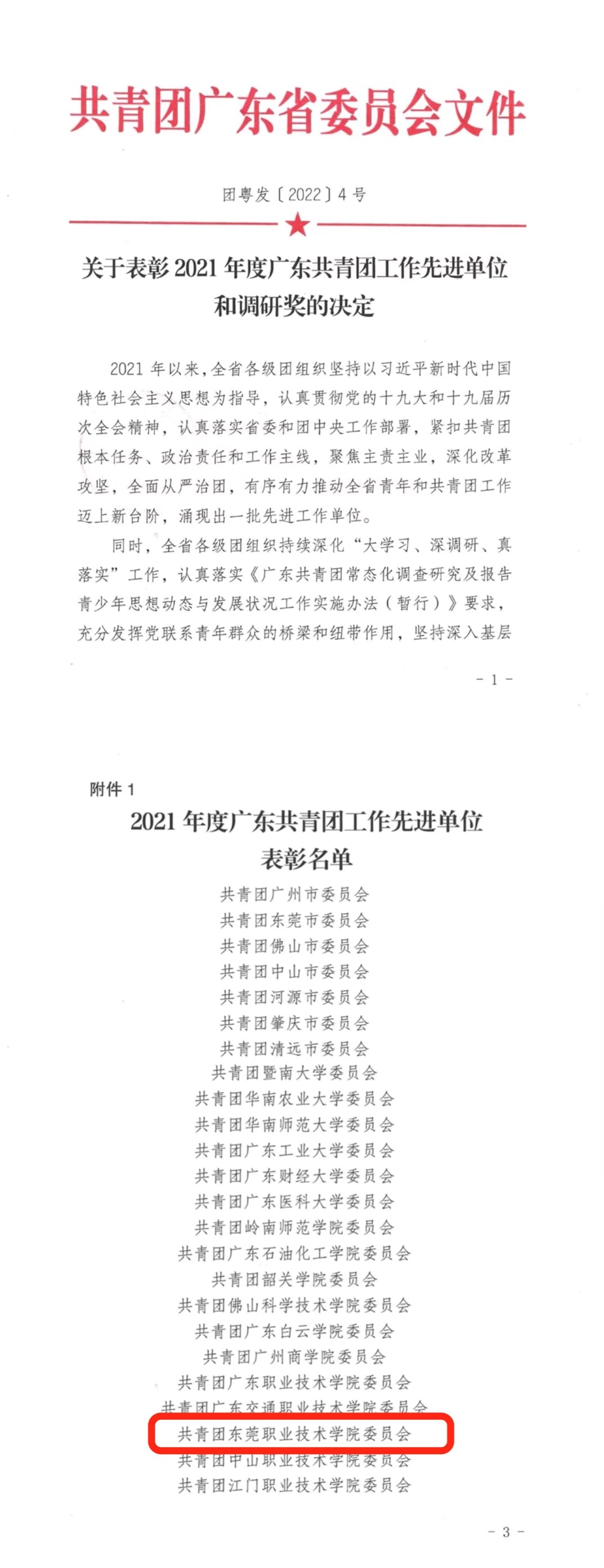 2021年,学校党政一如既往支持和关心学校共青团深化改革。校团委在学校党委的领导下,在上级团委的指导下,以“灯塔工程”为总抓手,扎实开展党史学习教育,举办“微团课”大赛培育朋辈党史领学人,制作庆祝建党百年云端汇演,开展校院两级“灯塔学习会”17场,入选广东省高校百校百场“灯塔学习会”第17站。组织团员和广大青年参与团中央“青年大学习·一起学党史”网上主题团课,参学率超100%,居全省高校前10名,全市高校第1名。狠抓“命脉工程”,扎实开展“活力在基层”主题团日竞赛,获省级百优项目4项。在2020-2021年度全国、全省、全市“五四”表彰中获个人和集体荣誉29项。校学生会获评广东省优秀学生会。原应用外语系团总支获“全国高校活力团支部”、电子协会获全国百强学生社团。在“挑战杯”广东大学生课外学术科技作品竞赛中总成绩位列全省高职院校第3名,获得“优胜杯”“优秀组织奖”。培育“莞乡情·云贵行”——kaiyun中国官方网站支教助农志愿服务项目,获2021年“益苗计划”广东志愿服务项目大赛省级示范项目、广东省最佳志愿服务项目等多项荣誉。