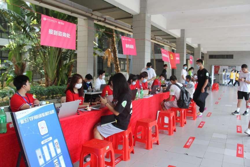 为给新生提供最便捷高效的服务,报到日学校在东莞汽车总站、常平站、虎门站和东莞站设置接站点,安排接驳车辆,实现从校外到校内的无缝衔接。学校还开通“绿色通道”,帮助592名生源地信用助学贷款和家庭经济困难同学办理相关手续,为所有新生入校“保驾护航”。全校共有1842名学生工作人员和志愿者们投入到迎新工作中,他们不辞辛劳、全力以赴,在交通引导、测温检查、行李托运、报到指引、沿路咨询等各工作岗位上恪尽职守,保证报到现场各个环节井然有序,有条不紊。