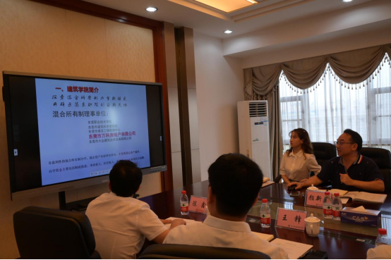 建筑学院院长颜新宁对建筑学院混合所有制建设与发展、师资建设、专业设置和学生培养等基本情况进行了介绍,他期待双方开展学生实习与就业、产学研等多方面合作与交流。