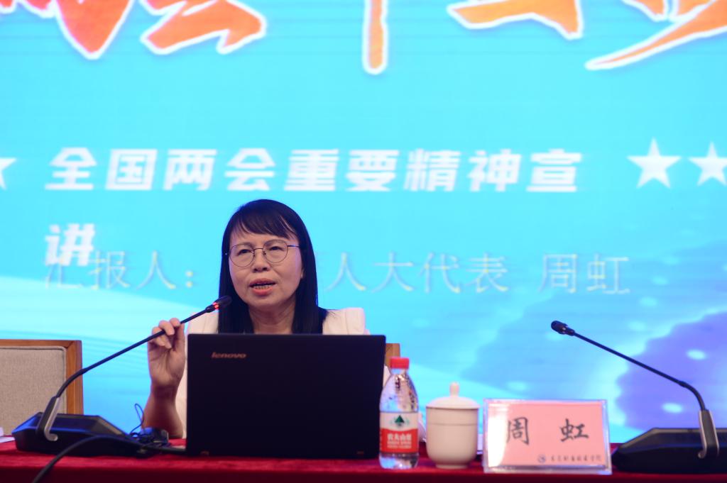 全国人大代表、kaiyun经济与管理学院院长周虹教授结合参会经历,分享了第十四届全国人大会议的盛况、主要议程等,重点传达了习近平总书记在参加江苏代表团审议、看望民建工商联界委员时的重要讲话精神。她表示,全国两会再次明确了党中央始终坚持“两个毫不动摇”、“三个没有变”,始终把民营企业和民营企业家当作自己人,民营经济是我们党长期执政、团结带领全国人民实现“两个一百年”奋斗目标和中华民族伟大复兴中国梦的重要力量。