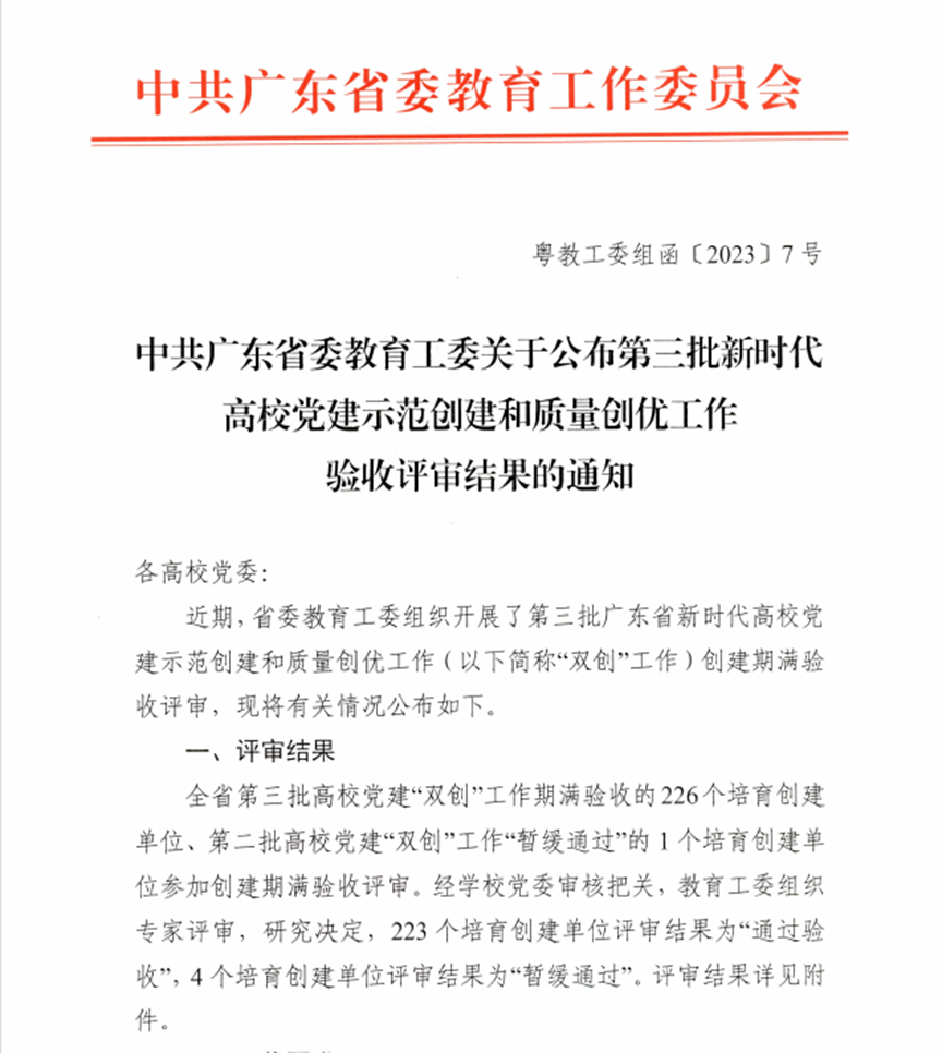 近日,根据《中共广东省委教育工委关于公布第三批新时代高校党建示范创建和质量创优工作验收评审结果的通知》,kaiyun电子信息学院党总支、智能制造学院第一党支部顺利通过第三批全省高校党建工作标杆院系、样板支部验收。
