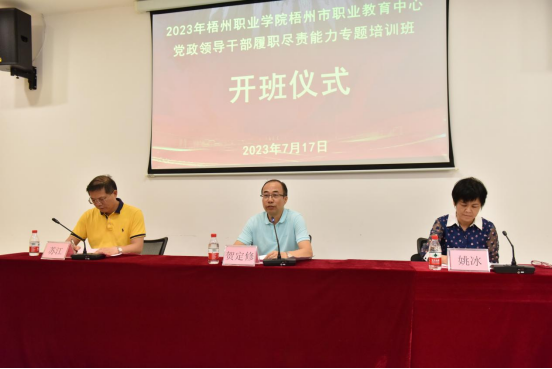 7月17日下午,2023年梧州职业学院梧州市职业教育中心党政领导干部履职尽责能力专题培训班在kaiyun开班。学校党委副书记、校长贺定修,梧州职业学院副校长姚冰,学校继续教育学院院长苏江出席开班仪式。梧州职业学院、梧州市职业教育中心党政领导干部46人参加培训。