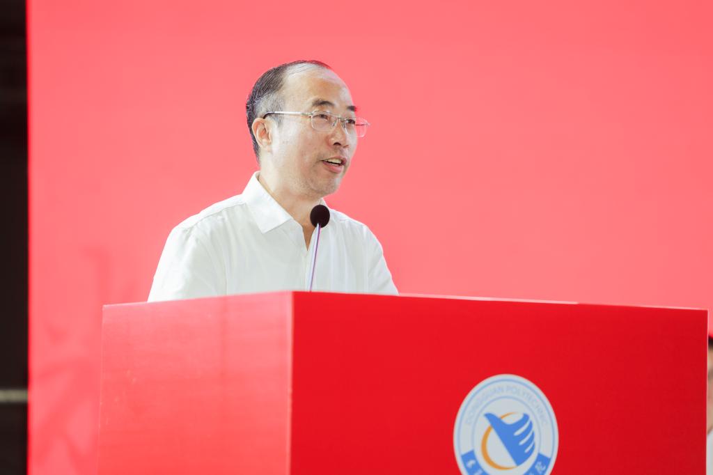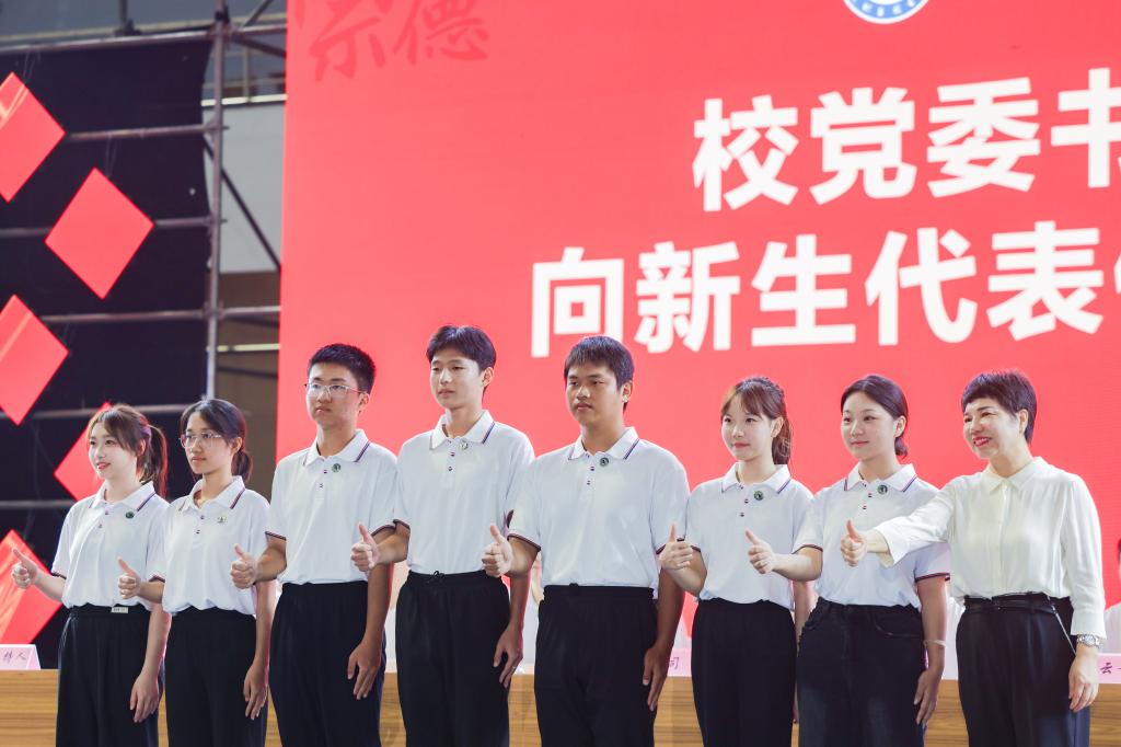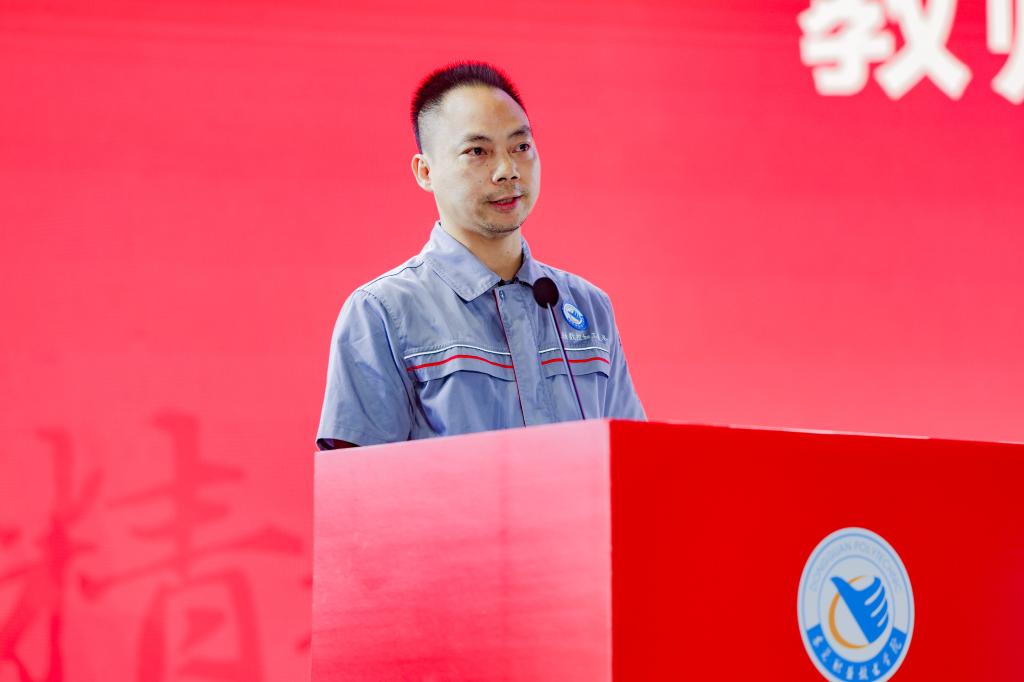 在校生代表人工智能学院钟烨和卫生健康学院新生代表廖振泽先后发言。他们共同提及“崇德、笃行、精技、创新”的校训,并表示将不负韶华、奋勇拼搏,为学校高质量发展贡献青春力量。智能制造学院李笑勉老师,作为教师代表向新生送出寄语:“要以技能成就未来,凭坚持铸就精彩”。