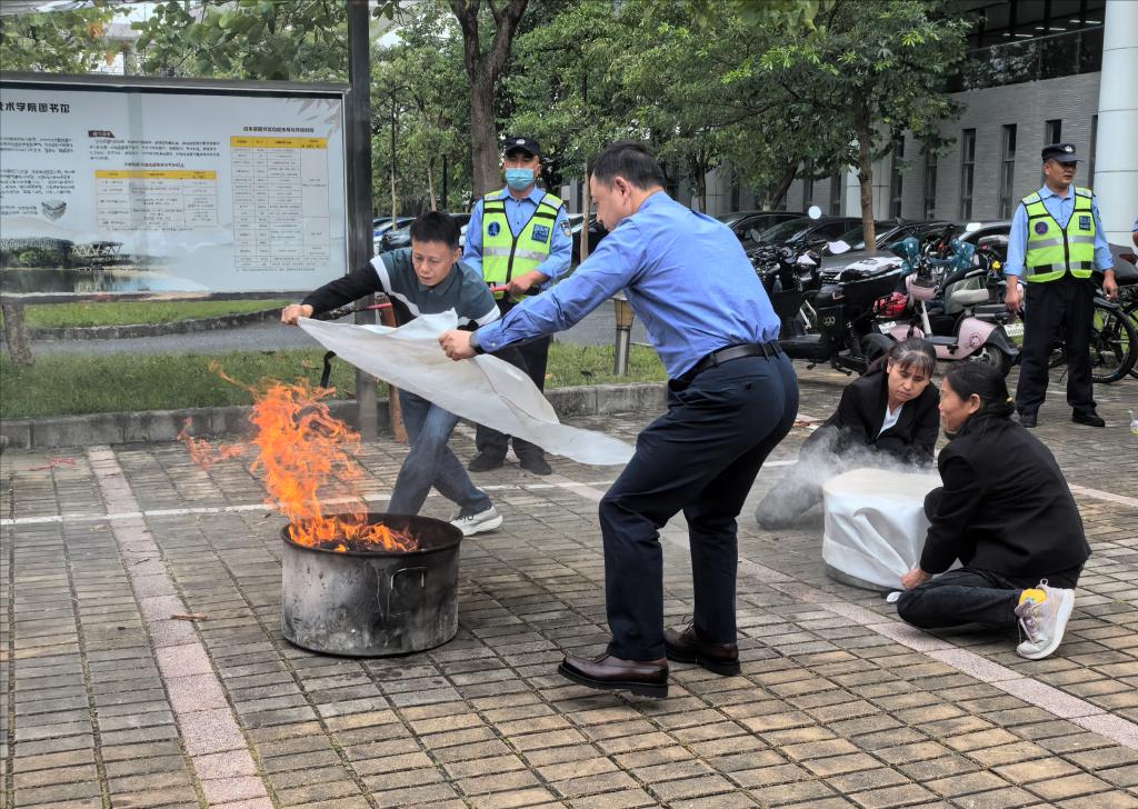 理论授课后,参训人员在安保人员现场指导下,有序开展灭火器、灭火毯实操训练。在实际操作中严格规范操作流程,切实掌握器材使用技能。