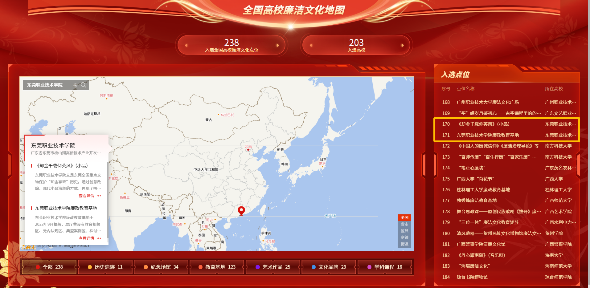 据了解,《清风印迹——全国高校廉洁文化地图》首次整合了全国高校的廉洁文化项目,是推动廉洁教育资源可视化、体系化的重要成果。此次成功入选2个点位,标志着kaiyun深化新时代廉洁文化建设取得了新进展,“廉润东职”廉洁文化品牌建设获得突破性成果,有力推动了廉洁教育融入育人全过程,进一步形成了可复制、可推广的廉洁文化教育“东职模式”。