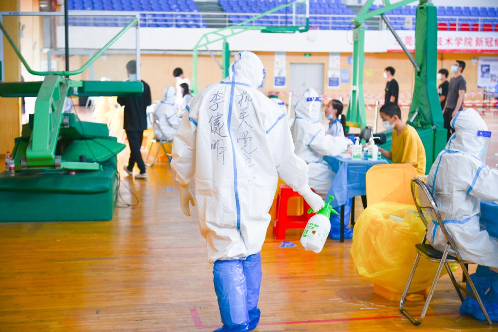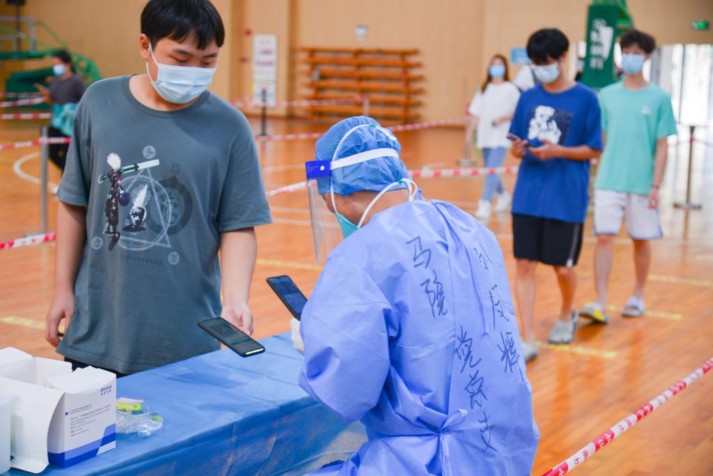上午8点15分,来自三个党总支的党员教师志愿者按时来到了体育馆的核酸检测现场,认真地参加岗前培训,学习如何扫码,如何穿戴防护设备,如何消毒,尽快熟悉这些相对专业的医护流程。尽管来自三个党总支,但大家通过培训和互帮,相互激励和鼓劲,在很短时间内掌握了岗位职责的基本技能,凝聚成了团结有效的工作团队。