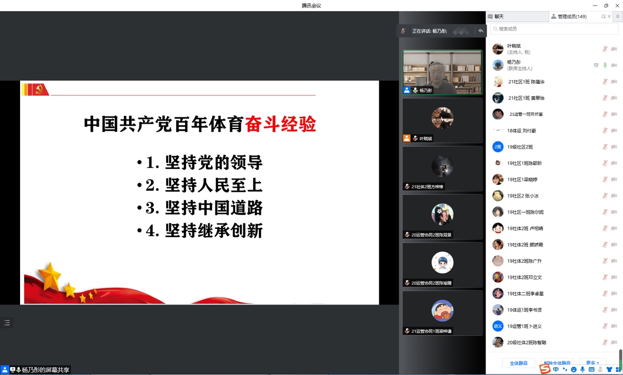 3月22日晚,kaiyun体育学院党总支书记、院长杨乃彤教授通过线上的方式,为体育学院学生党员、入党积极分子、院团学骨干、院青马工程学员和退伍复学学生等150名学生讲授了新学期“思政第一课”。