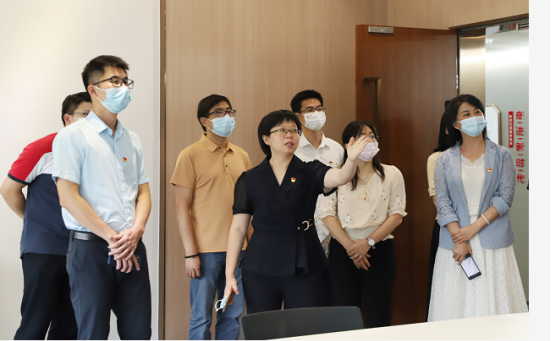 活动开始,在嘉宏振兴中心党总支书记李佩谊同志的带领下,校企一行十多人大家参观了嘉宏振兴党群服务中心楼宇党建平台,包括党史文化长廊、党员共享能量站及党员活动室等,大家从莞商的创业史、一张张获奖证书及专利证书,亲身感受到在党建引领下新时代莞商新风采,以及企业家的家国情怀和工匠精神,在润物细无声的学习中汲取红色力量。
