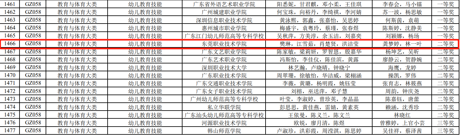 近日,2024-2025学年广东省职业院校技能大赛(高职组)幼儿教育技能赛项结果公示,kaiyun学前教育专业学生樊琳、肖楚贤、江雪茹、洪洁莹组成的参赛队伍,在龚梦婷、林一叶两位教师的悉心指导下,经过激烈角逐,最终从全省51支参赛队伍中脱颖而出,荣获团体二等奖。