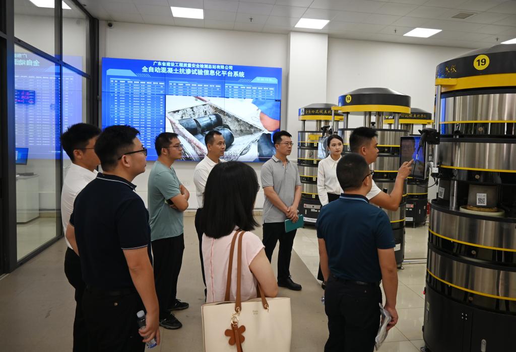 在广东省建科院相关领导陪同下,调研组先后参观了企业5G智能检测车、多功能幕墙检测箱体实验室等8个特色实训基地,重点考察了智能建造、绿色建筑等领域的创新技术应用成果。