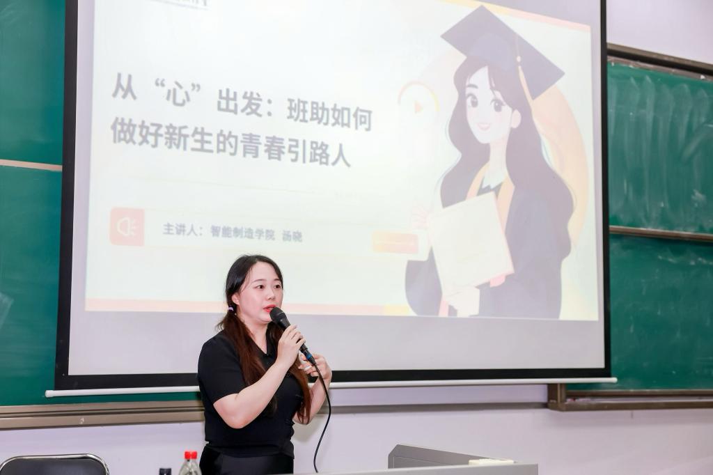 理论培训环节特邀智能制造学院团委书记汤晓老师担任主讲。汤老师以《从“心”出发:班助如何做好新生的青春引路人》为题,结合多年学生工作经验,从角色认知、沟通艺术、心理疏导、学业指导等多个维度进行了深入浅出地讲解。她强调,优秀的班助应当兼具“向导”“知心朋友”和“成长伙伴”三重身份,并通过生动的案例分析,传授了处理新生常见问题的实用技巧,为班助们提供了可借鉴的工作方法。