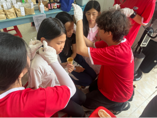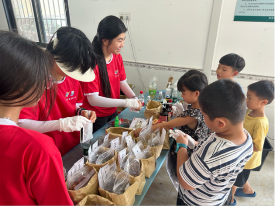 活动现场,队员们以亲切的乡音为村民提供多元健康服务。在诊疗区,队员们耐心为村民测量血压、血糖,详细了解身体状况及病史,指导科学用药、合理饮食与运动,倡导健康生活方式。传统中医疗法体验区同样热闹,耳穴压豆、气罐、推拿、艾灸等项目吸引众多村民体验。此外,队员们还带领村民制作中药香囊,派发学院精心准备的紫草膏和养生中药饮。“效果真好,身上轻松多了!看到家乡的孩子回来服务,心里特别暖。”参与活动的村民纷纷点赞。