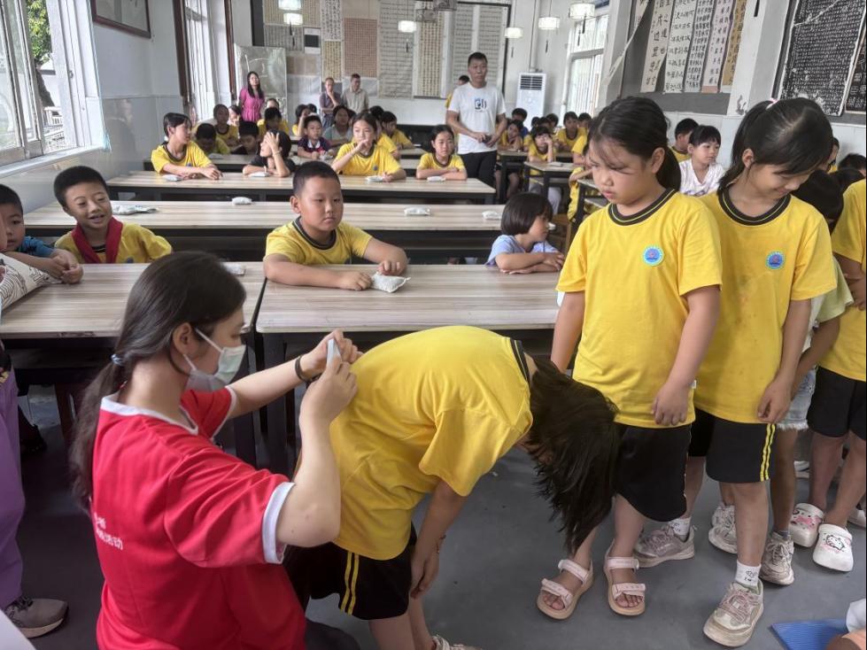 期间,突击队创新推出“场景模拟+一对一纠正”的培训模式,用当地方言教学,使100余名村民和镇村干部掌握了心肺复苏技能和脑卒中BEFAST口诀,有效提升了基层应急救护能力。在江湾镇中心小学,队员们用专业脊柱侧弯测量仪为全校学生筛查,发现3例可疑早期侧弯,并将名单转交学校跟进。获校方高度评价:“东职院师生的专业筛查为早干预抢出了关键时间!”
