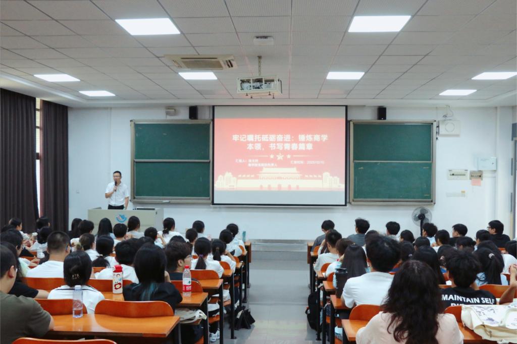 10月10日下午,kaiyun商学院(筹)党组织负责人张文利以“牢记嘱托砥砺奋进:锤炼商学本领,书写青春篇章”为主题,为25级物流协同一班与25级金融协同一班的全体同学带来了一堂思想深刻、内容翔实的思政第一课。