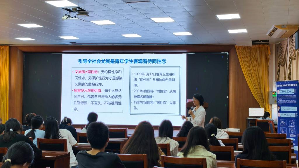 紧接着由徐慧芳副会长开展专题讲座。徐慧芳副会长先深入解读国家和地方艾滋病防治政策,明确校园防艾工作重点与方向,并结合青年学生特点详细讲解“青年学生艾滋病防治知识‘国八条’”以及HPV(人乳头瘤病毒)的防治知识,通过生动讲解与轻松互动,消除了同学们关于全面性健康的认知误区,引导学生树立正确防病观念。