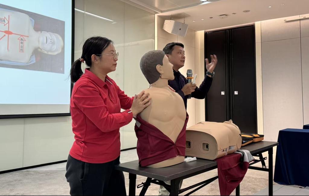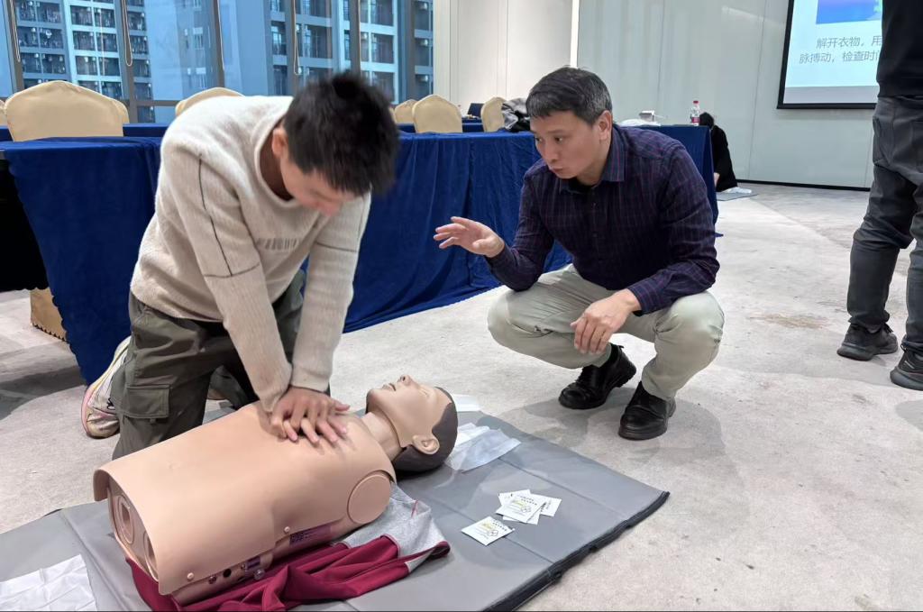 在实操练习环节,参训学员分组进行实操演练。姜林辉与黄丽萍两位老师全程指导,纠正学员操作中的不规范之处,耐心解答疑问,确保每位学员都能真正掌握急救技能。学员们学习态度认真,积极参与互动,现场学习氛围浓厚。