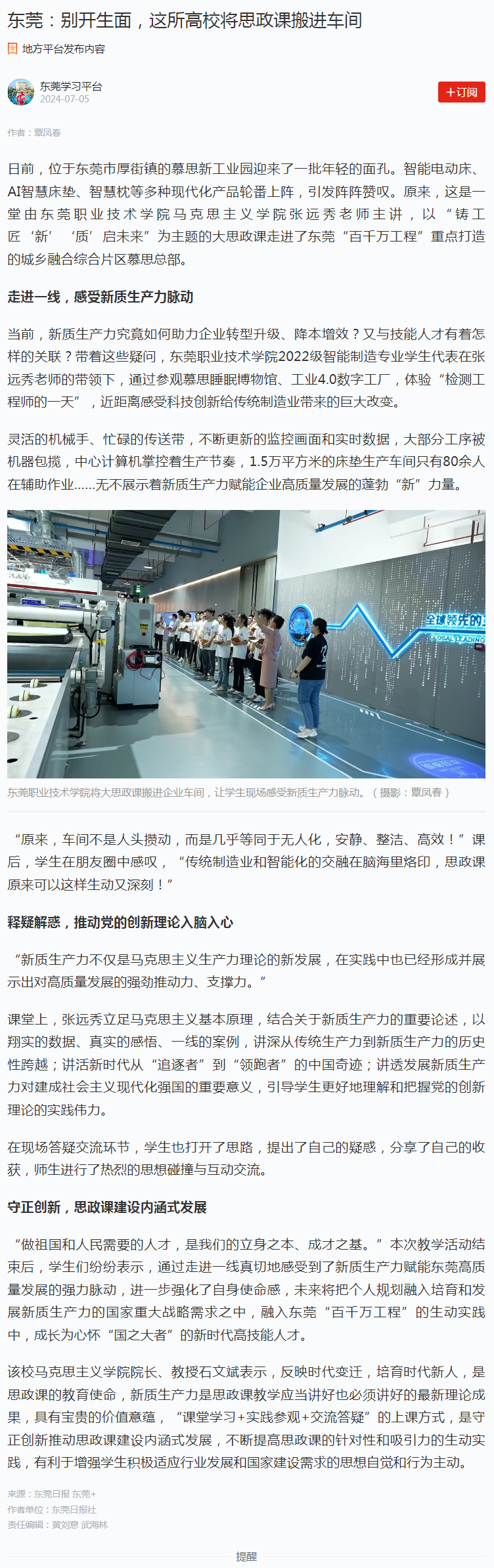 【学习强国】东莞:别开生面,这所高校将思政课搬进车间