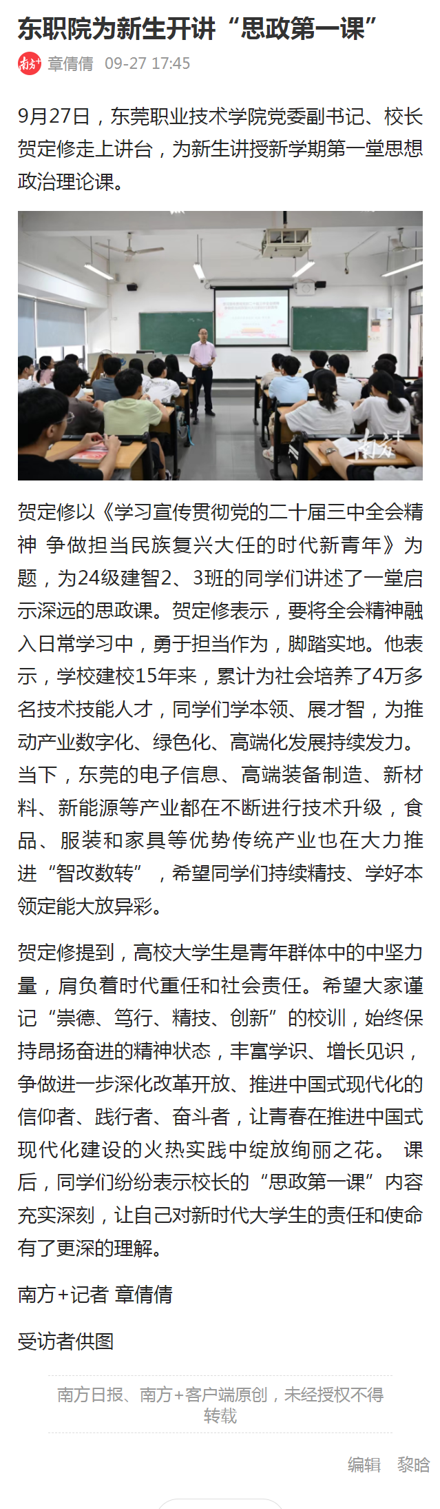 【南方+】东职院为新生开讲“思政第一课”