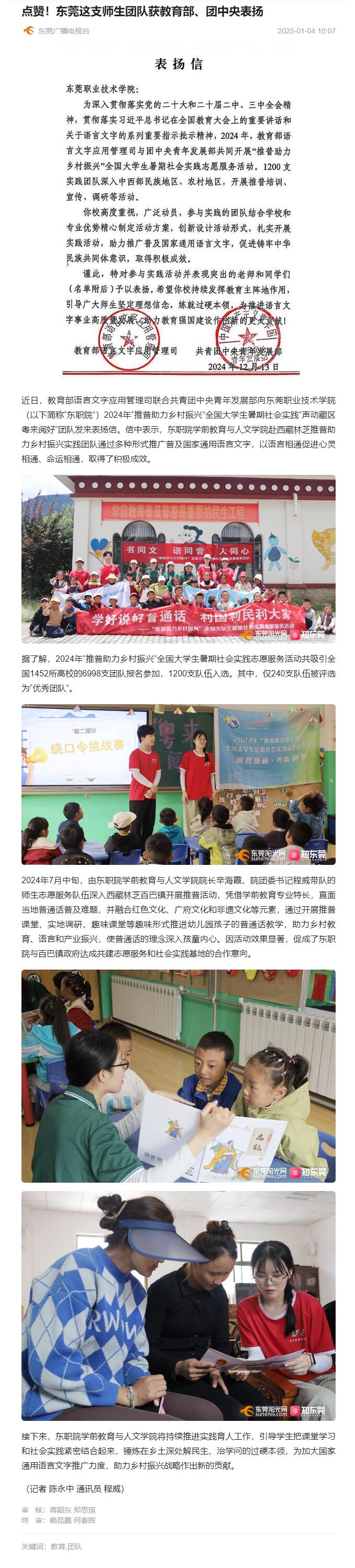 【东莞广播电视台】点赞!东莞这支师生团队获教育部、团中央表扬