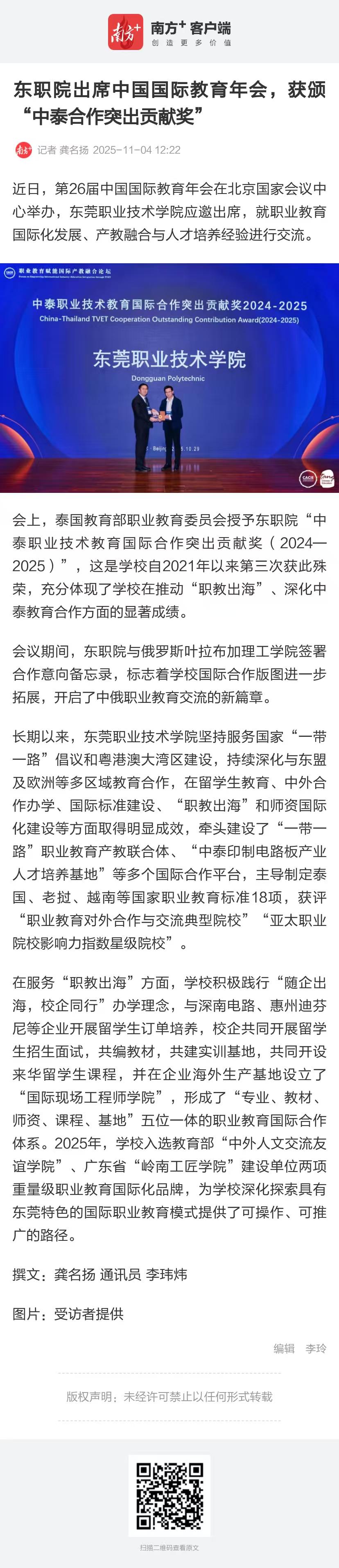 【南方+】东职院出席中国国际教育年会,获颁“中泰合作突出贡献奖”