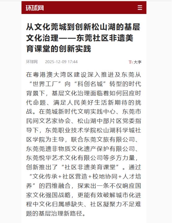 【环球网】从文化莞城到创新松山湖的基层文化治理——东莞社区非遗美育课堂的创新实践