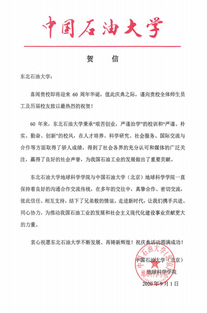 中国石油大学(北京)beat365在线唯一官网向我校发来贺信