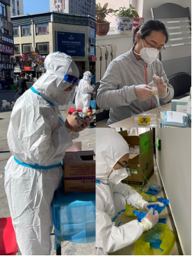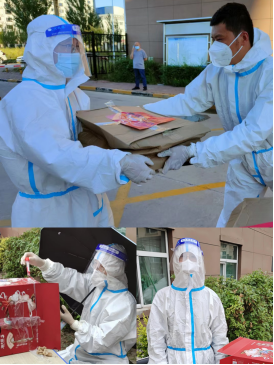 学院志愿者中,上至70后,下至90后,每个人都在防疫工作中贡献自己的力量:核酸检测扫码、秩序维护、蔬菜包发放、试剂盒分拣、保供物资的配送等等。曾科、李婷婷、杨霄宇、刘云鑫坚守在核酸检测扫码工作的岗位上;冯进来、刘宗堡、张雷、刘丽红、张博为、袁红旗为社区居民分发蔬菜包;韩刚、代天骄、陈海峰、谢昭涵、李晶晶、胡欣蕾、姜艳娇、于英华、张姣在小区巡逻、维持秩序;朱焕来、张永峰、刘峻桥、王野、张宇薇还身兼“楼长”一职,统计本楼居民日常急需用品等;何春波为居民发放抗原检测试剂;刘晓文为社区医护人员提供服务。