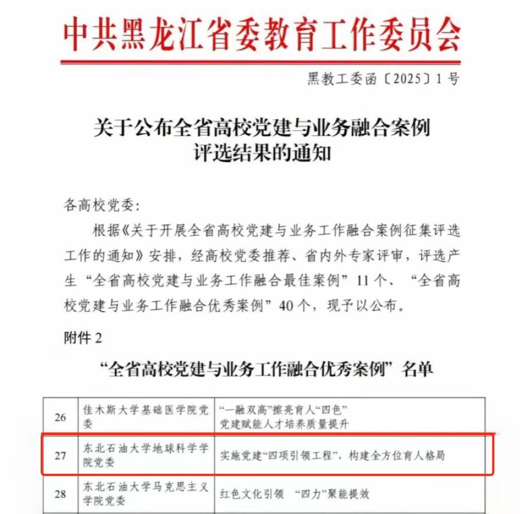beat365在线唯一官网党委始终坚持政治建设为统领,以立德树人为根本任务,以提高人才培养质量为核心,实施党建“四项引领工程”,秉持服务地方的育人理念,充分发挥科研育人功能,打造具有地学特色的“三全育人”工作格局。下一步,学院党委将在学校党委的领导下,坚持以习近平新时代中国特色社会主义思想为指导,深入学习贯彻落实党的二十大及二十届历次全会精神,坚持和加强党的全面领导,坚守为党育人、为国育才的初心使命,树牢党建与业务工作融合发展理念,创新打造融合发展有效载体,促进学院党建与人才培养、科学研究、社会服务、文化传承创新、国际交流合作等业务工作一体推动、融合发展。解放思想,奋楫争先,积极落实学校第二次党代会目标任务,以高质量党建引领学校高质量发展,坚定不移推进学校基层党组织建设,为加快建设国内著名国际知名的一流能源大学提供坚强组织保证。