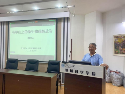 会上,柳成志教授介绍了微生物岩石的概念、发展历史及分类,全面深入讲解了柳江盆地亮甲山组微生物碳酸盐岩的宏观与微观特征、形成机理和发育模式等内容,结合亮甲山组丰富的碳酸盐岩类型,总结了凝块石生物丘、叠层石生物丘、均一石生物丘、迷宫状生物丘和复合状生物丘等多种模式。讲座现场气氛热烈,学院师生围绕相关主题展开了深入讨论。