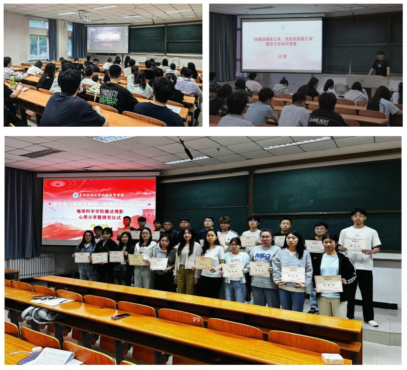 举办学生活动,营造尚廉氛围。6月4日,学院开展了“树廉洁自律崇高风尚”廉洁文化观影活动。活动创新采用“理论+警示”双轨教育模式,精选《零容忍》《永远吹冲锋号》两部国家级反腐纪录片作为核心教材,深刻揭示了腐败行为对个人、家庭乃至党和国家的巨大危害。6月12日,举办“扬廉洁诚信之风,筑优良校园之基”廉洁文化知识竞赛暨主题党日活动。活动设置必答题检验廉洁理论知识基础,抢答题则聚焦廉洁故事、党纪法规等,考验知识储备与临场反应。在学院内营造了崇廉尚洁的良好氛围。活动反响强烈,同学们积极撰写观后感,廉洁自律意识得到显著提升。