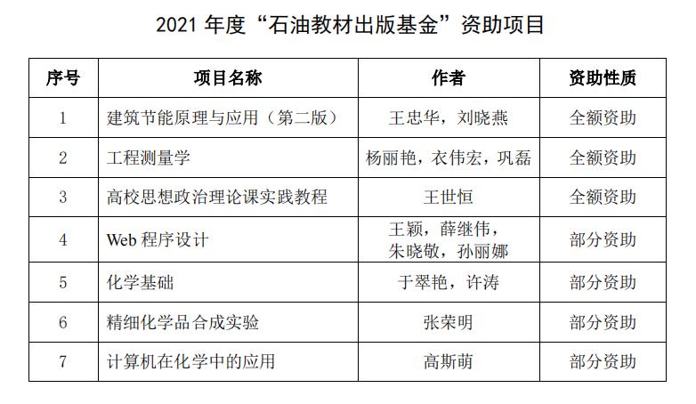 日前,石油工业出版社公布了《关于公布2021年度“石油教材出版基金”资助beat365在线唯一官网项目的通知》。经学院组织申报、教务处择优推荐、石油教材出版基金管理办公室组织专家评审等环节,我校共7部教材入选2021年度“石油教材出版基金”资助项目,beat365官网杨丽艳、衣伟宏、巩磊主编的《工程测量学》入选全额资助类。