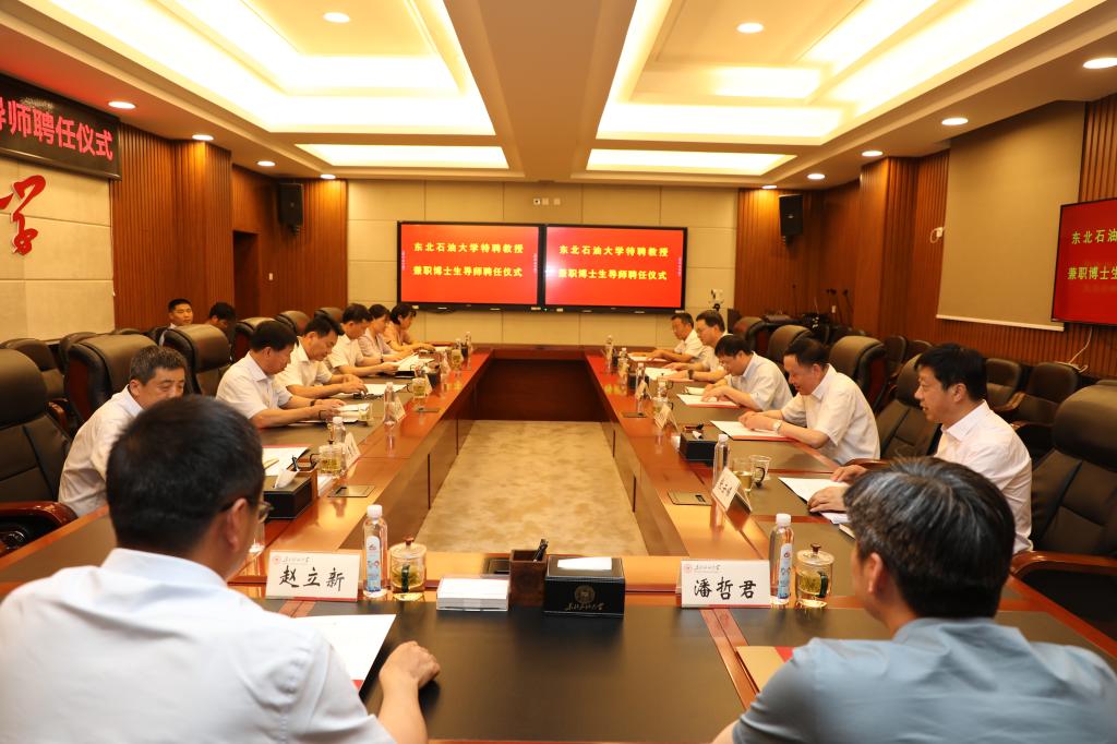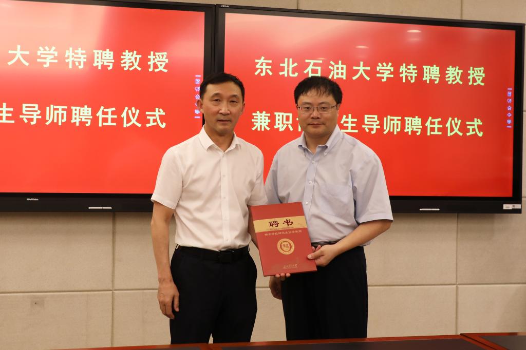 (文/图 吕鸿浩)7月16日,我校在机关5楼会议室举行聘任仪式,大庆油田党委常委、大庆油田有限责任公司(大庆石油管理局有限公司)副总经理兼总地质师何文渊受聘为我校特聘教授、兼职博士生导师。大庆油田有限责任公司首席技术专家、我校提高采收率研究院名誉院长程杰成,大庆油田有限责任公司技术发展部主任王刚,我校领导孙明学、蒋明虎、高洪峰、董宏丽及科研处、人事处、研究生部、beat365在线唯一官网、石油工程学院、非常规油气研究院等单位相关负责人参加聘任仪式。副校长高洪峰主持聘任仪式。