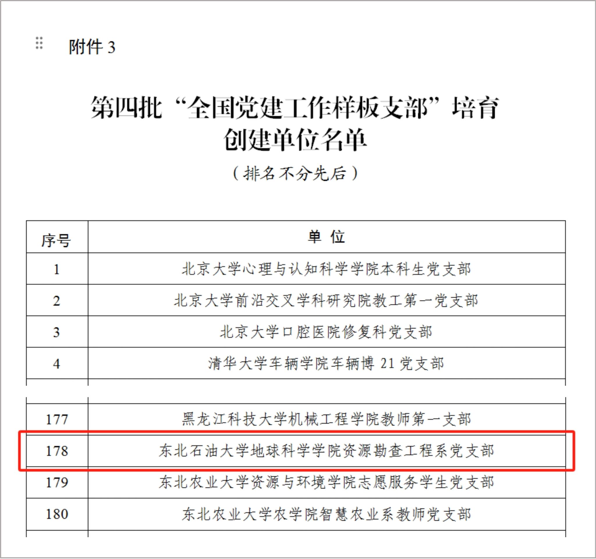 (通讯员 周全 记者 吕鸿浩)近日,教育部办公厅公布了第四批全国党建工作示范高校、标杆院系、样板支部培育创建单位名单,beat365官网资源勘查工程系党支部入选样板支部培育创建单位。目前我校共有4个党支部先后入选全国党建工作样板支部。