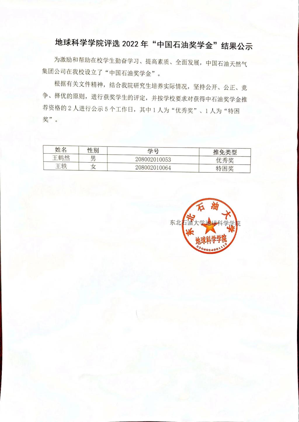 beat365在线唯一官网2022年中石油奖学金评选结果公示