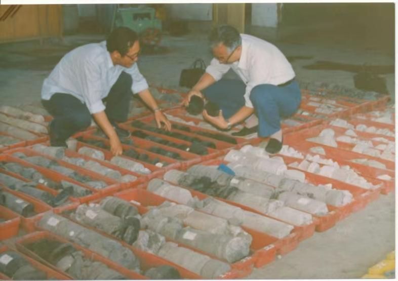 陈章明(右一)在油田现场进行岩心观察工作